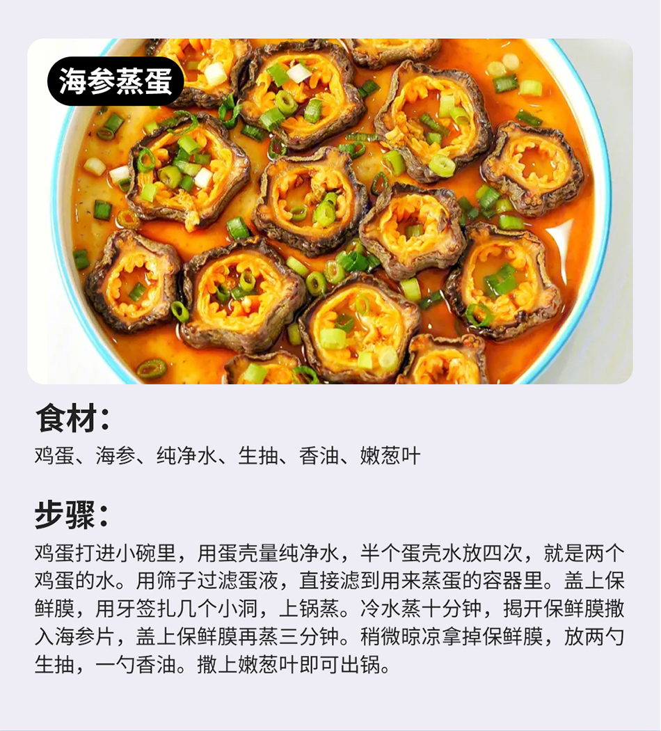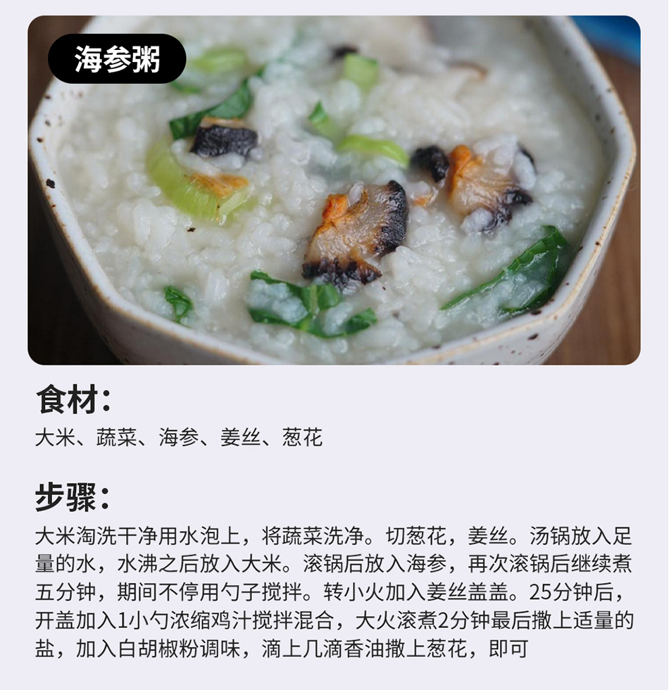 即食海参煲汤煲粥都很好吃,早上熬粥吃也容易消化,经常吃海参能提高免疫力
